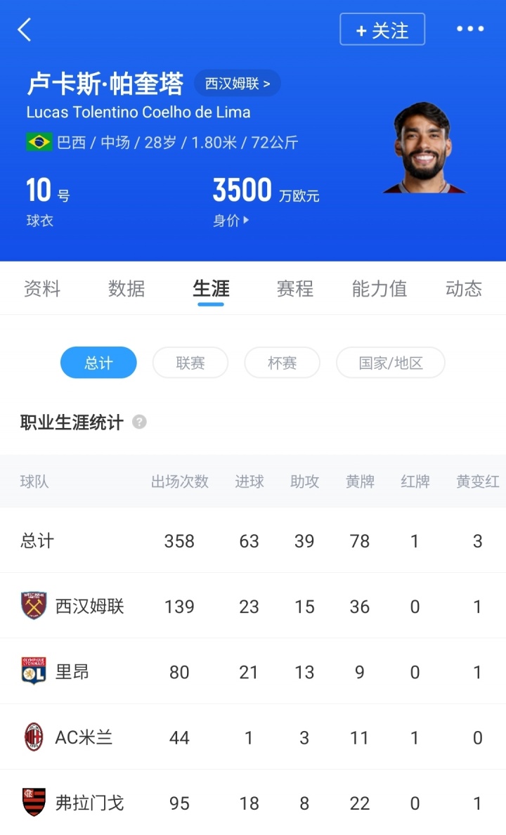 帕奎塔出道于弗拉门戈青训,2019年冬天登陆欧洲加盟AC米兰。西汉姆联在2022年夏天花费4295万欧从里昂引进帕奎塔,截至目前,帕奎塔共代表西汉姆联出战139场,贡献23球15助攻,其中本赛季19场5球1助。