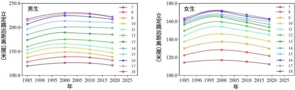 然而,今年发布的一项研究显示,2000年到2010年期间,7~22岁各年龄段男生和女生的立定跳远距离均降低,并在2010年到2019年期间加速下降。