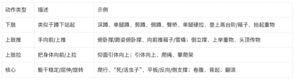 如果自己带孩子做抗阻运动,需要特别关注在当前的发育和体能状况下,孩子能否做到正确动作。未成年前多选择全身参与的动作,而不是像健美训练那样专注于一个肌肉或肌群。尽量以游戏的形式开启抗阻运动,每周计划至少覆盖以下4种动作类型: