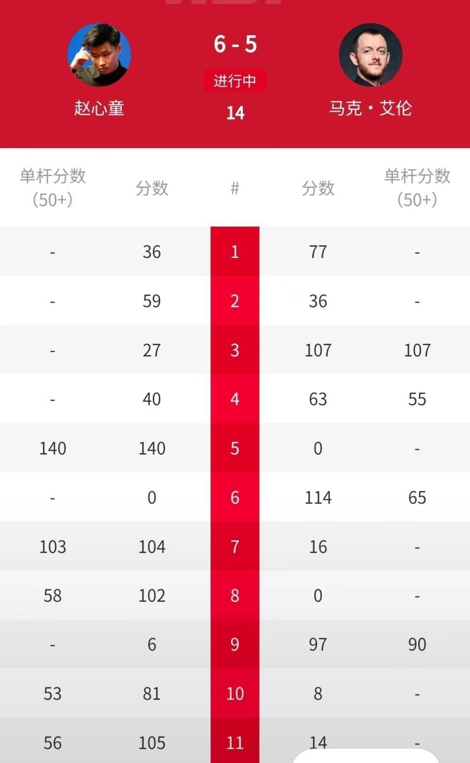 来到半决赛,状态火爆的“小钢炮”面对状态同样霸气的赵心童,上半场3-1领先。下半场,赵心童加强攻势,4-4扳平比分。第九局,“小钢炮”单杆90分赢得赛点。绝境下,赵心童打出两杆50+,连扳两局之后,以总比分6-5逆转晋级。在首轮4名中国选手出局的情况下,赵心童以3连胜打进决赛,展示出了非常好的实力进而心理素质,期待在与“巫师”希金斯的决赛中,能够再接再厉赢得冠军!