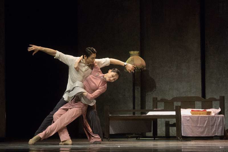 在排练厅里,一场舞剧叙事的革新悄然开启。韩真和周莉亚创造性地将电影蒙太奇思维引入舞台,探索独特的“舞台蒙太奇”。裁缝店场景中,她们采用极具代表性的“倒带式回放”,让演员的动作如影像倒流般带领观众回到事件起点,从另一个视角揭示真相。但这仅是开始,一系列突破常规的手法被引入舞台:四组双人舞同时在台上展开,将男女主人公之间的感情历程,呈现在一个舞台空间,创造了其他艺术形式难以企及的叙事密度。