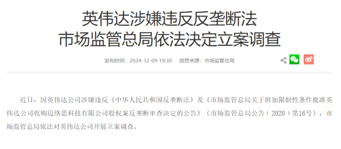 2024年12月9日,市场监管总局就曾发布通告,称英伟达涉嫌违反反垄断法,决定立案调查,而此番是确定其违法。