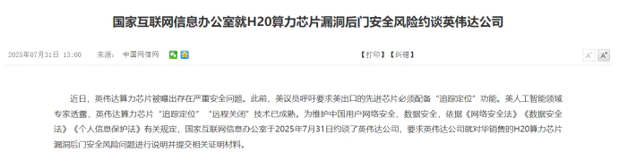 不过,在7月份,中国主管部门已经敲打过一次英伟达。当时,国家互联网信息办公室约谈英伟达,提出其H20算力芯片就漏洞后门安全风险进行说明。