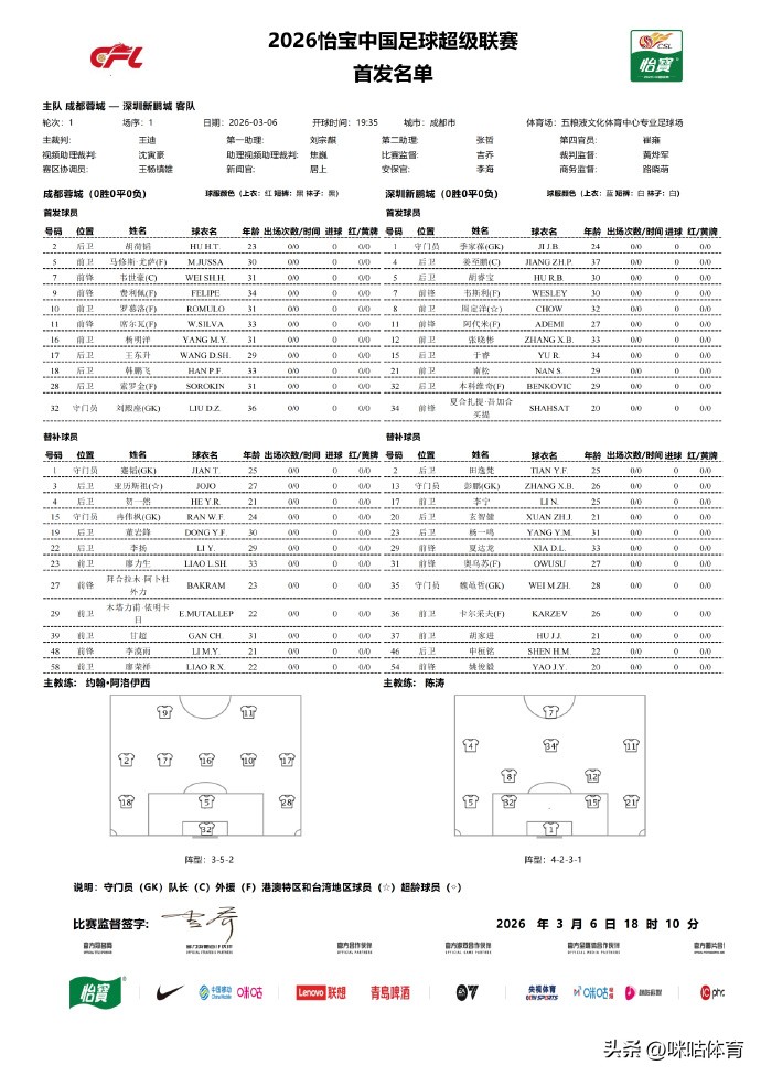 北京时间今晚19点35分,2026赛季中超第1轮,成都蓉城主场对阵深圳新鹏城,赛前双方公布首发阵容。