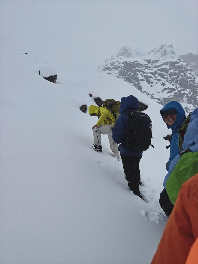 10月5日早上8时,山中的暴风雪暂停,“无极”一行也决定在一个半小时后的9点半左右出发。“我们基本上什么重装都没带,只用背包带了当天吃喝的,还有装备里的保暖羽绒服,抓绒衣,其他的衣物都放在了营地。”“无极”说,当时的营地大约有100多人是游客,还有领队、协作一共总人数加起来有两三百人,“其他队伍看到我们走得有点远了,也就跟了上来”。