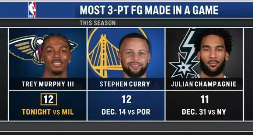鹈鹕:墨菲12记三分44分6篮板6助攻3抢断,三分命中数与得分均创生涯新高纪录,追平库里并列本赛季单场三分命中数联盟第一。贝4记三分22分,锡安20分5篮板8助攻,费尔斯13分。