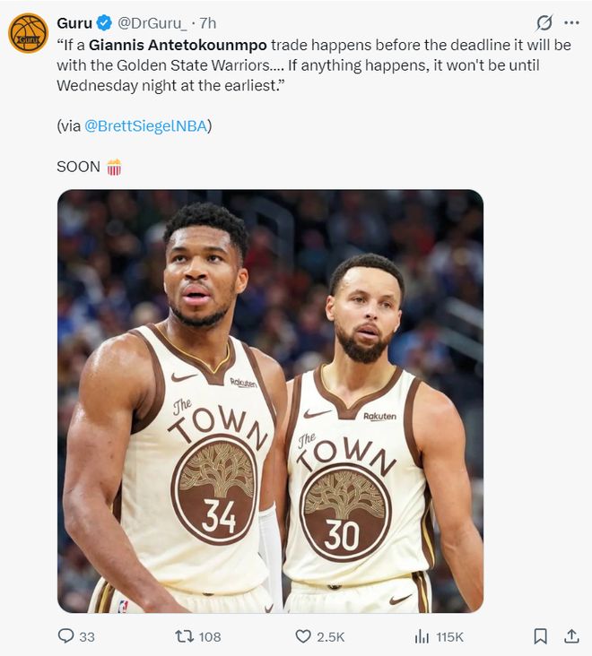 北京时间2月2日晚,根据美记BrettSiegel的报道,假如扬尼斯会在交易截止日前被交易,那么大概率扬尼斯的下家就是金州勇士队。此前金州勇士队已经表态球队只有库里一人是非卖品。