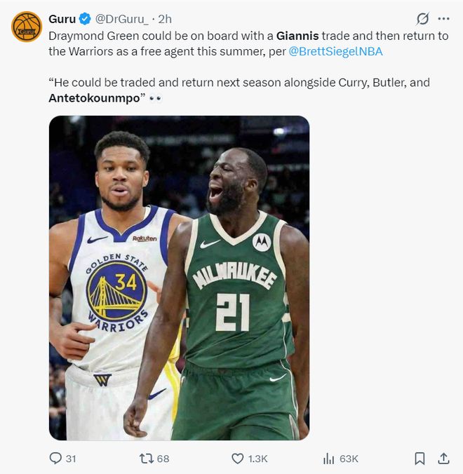 此前BrettSiegel就透露,勇士队最多可以为字母哥送上4个首轮签+1个首轮互换权,筹码方面德雷蒙德-格林都已经愿意充当扬尼斯的筹码,在下赛季合同到期后,勇士可以将追梦签回重新搭档库里。