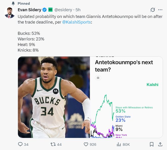 不过最新的扬尼斯下家概率已经更新,交易截止日后留守雄鹿53%最高,勇士23%,热火9%,尼克斯8%,看起来扬尼斯去哪儿很有可能要延续到休赛期。