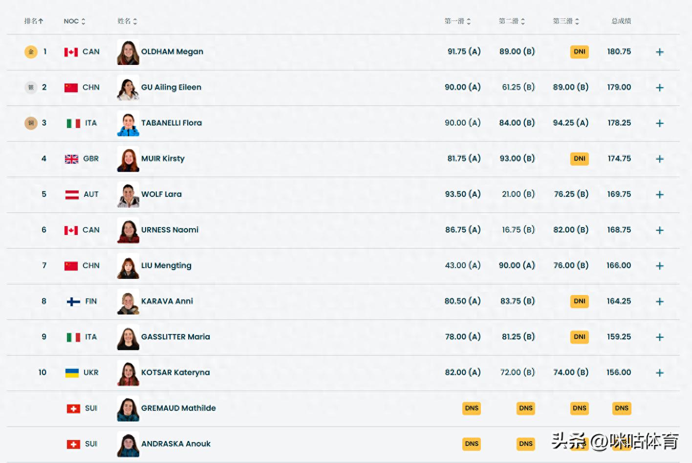 最终排名尘埃落定:加拿大选手梅甘·奥尔德姆凭借全程稳定的高光表现,以180.75分的总分登上冠军宝座;谷爱凌以179.00分的总分斩获银牌,为中国队再添一枚奖牌,这也是她本届冬奥会收获的第二枚银牌,同时她以职业生涯5枚冬奥奖牌的成绩,创造了自由式滑雪项目的冬奥奖牌新纪录;意大利选手弗洛拉·塔巴内利凭借单跳高分加持,以178.25分摘得铜牌,东道主成功收获该项目奖牌。