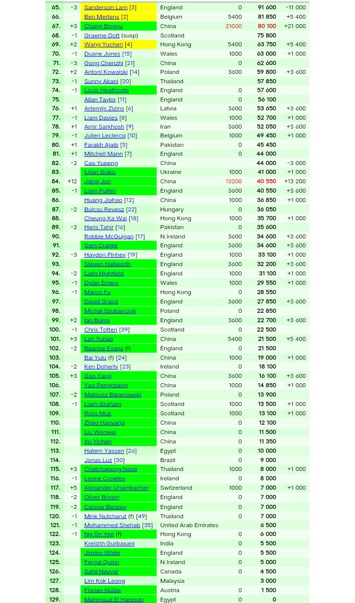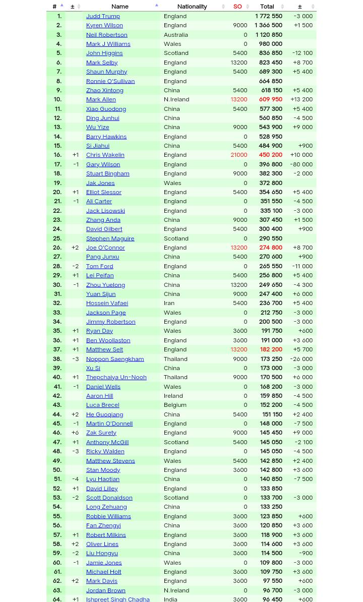 淘汰了周跃龙的韦克林重返top16,仅仅一站之差就错失大师赛资格,可见如今的竞争格局还是比较激烈的,尤其是本赛季以来的排名赛还没有人夺得两冠以上,唯一的两冠得主塞尔比是英锦赛冠军与冠中冠邀请赛冠军。无缘正赛的加里·威尔逊被反超,下降一位来到第17。