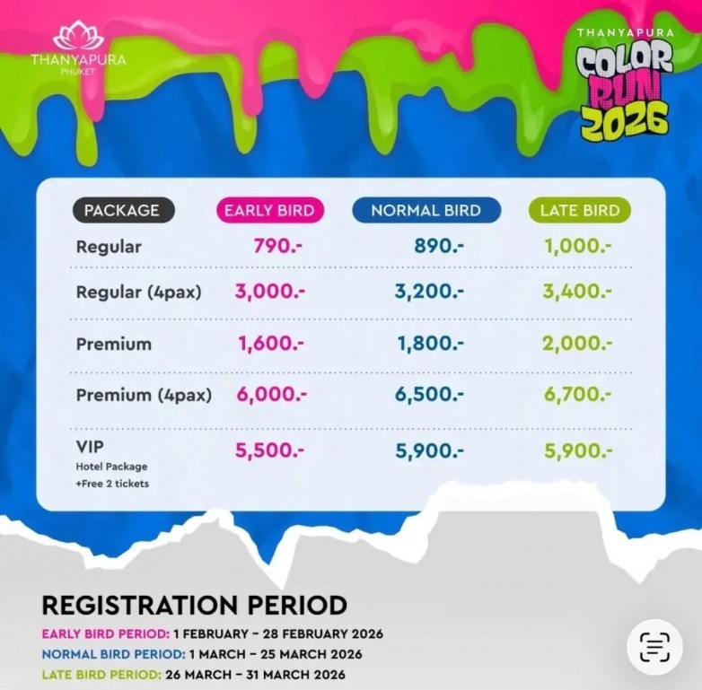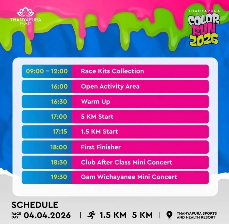 普吉岛最火热的 Thanyapura Color Run 再度来袭,就在4月4日上午9点!这不仅仅是一场跑步,更是一场席卷全身的色彩爆炸,一次彻底释放压力的狂欢派对。